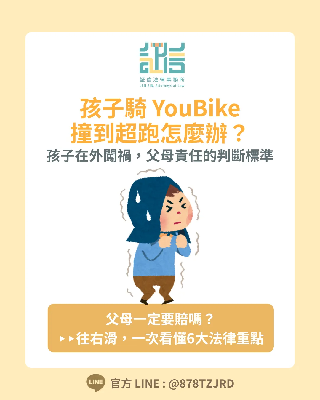 首頁 > 法律專欄 > 民法 > 【一次看懂 6 大重點】孩子騎 YouBike 撞到超跑怎麼辦?從實務判決解析父母的法律責任